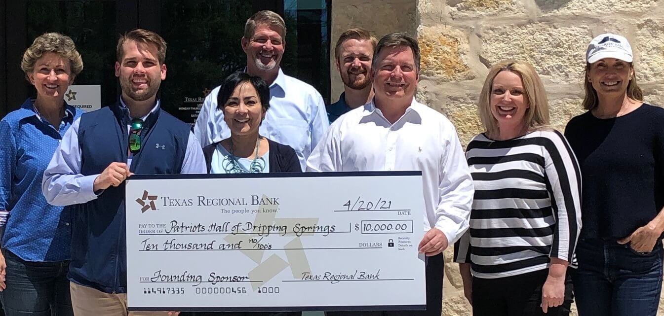 Texas Regional Bank joined several local businesses and citizens as a Founding Sponsor of the Patriots’ Hall VFW in Dripping Springs. The team of bankers presented Mary Jane Hetrick and Kathryn Chandler of Patriots’ Hall with a check for $10,000. “Our Veterans deserve a facility like Patriots’ Hall,” said Erin Needham, Dripping Springs Market President, “It’s an honor to give back to Veterans by supporting this initiative.”